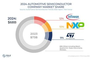 Pour le moment, l’analyste note que les leaders des semiconducteurs automobiles – parmi lesquels figurent les ténors européens Infineon Technologies, NXP Semiconductors et STMicroelectronics – maintiennent leur position. Ainsi, en 2024, cinq sociétés contrôlaient encore près de la moitié du marché mondial des semiconducteurs automobiles. Parmi celles-ci, Infineon, le leader du secteur qui génère plus de 8 milliards de dollars de ventes pour une part de marché de 12%, et domine sur le marché des modules de puissance Si/SiC, des drivers et des microcontrôleurs, NXP qui suit de près (10% du marché) avec une forte présence dans les microcontrôleurs de réseau embarqué, les radars et les émetteurs-récepteurs, ou encore ST (9% du marché) qui maintient son avance dans les domaines des composants discrets, de l’électrification et des plateformes MCU.