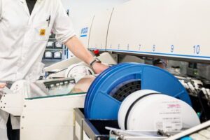 En production, un opérateur prépare la ligne CMS en installant les bobines de composants destinées à l’assemblage automatisé des cartes électroniques – © Unwabu Media – Marc Chazelle