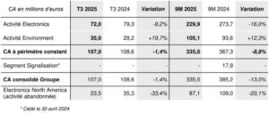Au troisième trimestre de son exercice 2025, le groupe Lacroix a réalisé un chiffre d’affaires consolidé de 107 millions d’euros, en légère baisse de 1,4% par rapport aux 108,6 M€ du troisième trimestre 2024. La société précise que ces chiffres excluent la filiale Electronics North America, comptabilisée en tant qu’activité abandonnée dans le cadre du projet de retrait définitif d’Amérique du Nord en cours de finalisation. Comme précédemment cette année, l’évolution des ventes de Lacroix au troisième trimestre reflète des dynamiques contrastées, avec une activité environnement (“Environment”) en forte progression (+19,7%) et une activité sous-traitance électronique (“Electronics”) qui reste en retrait (-9,2%) dans un contexte toujours difficile.