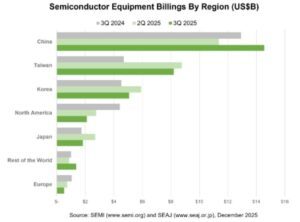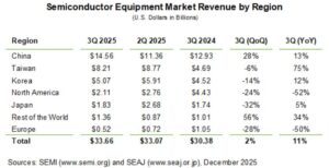 Si l’on en croit un récent rapport de l’organisation professionnelle Semi, les ventes mondiales d’équipements pour la fabrication de semiconducteurs ont augmenté de 11% sur un an au cours du troisième trimestre 2025, pour s’établir à 33,66 milliards de dollars (+2% par rapport au trimestre précédent).