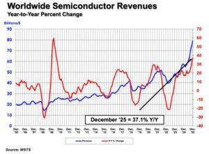 Selon les derniers chiffres compilés par le WSTS (World Semiconductor Trade Statistics) et publiés par la SIA (Semiconductor Industry Association), le marché mondial des semiconducteurs a atteint 78,9 milliards de dollars en décembre 2025 grâce à une augmentation de 37,1% en glissement annuel et de 2,7% en glissement séquentiel.