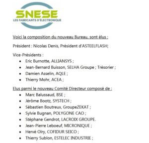 Cette assemblée a renouvelé l’ensemble des douze membres élus, accueilli un nouvel adhérent dans ses instances en la personne de Hervé Olry, dirigeant associé du groupe Cofidur-Seico, et désigné le président d’Asteelflash, Nicolas Denis, en tant que nouveau président du Snese, en remplacement d’Eric Burnotte (voir tableau en bas de cet article).